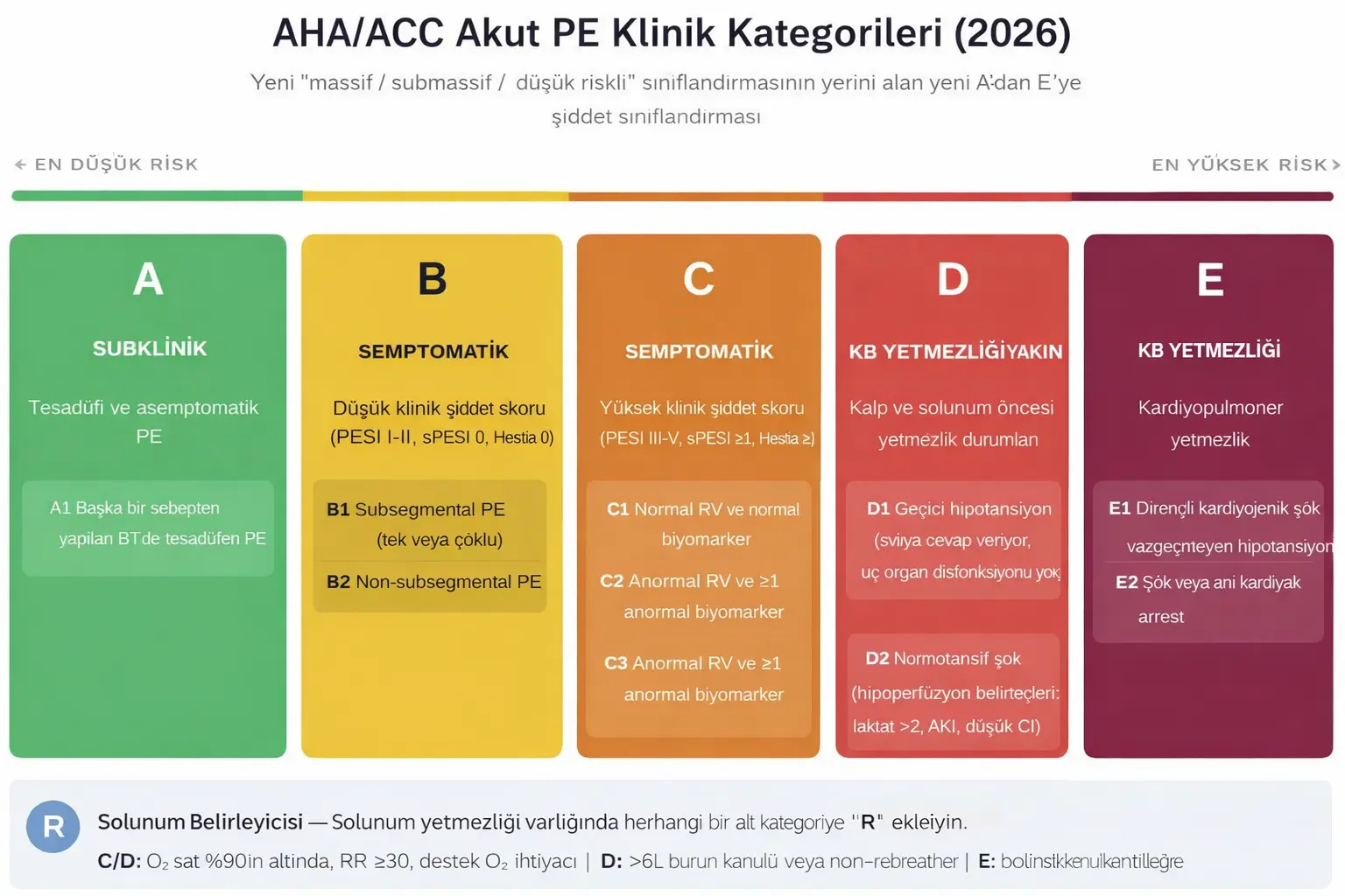 Kapsamlı şekilde yenilenmiş bir şiddet sınıflamasıdır. Eskiden kullanılan “massif, submassif ve düşük risk” terimleri kaldırılmış ve yerine AHA/ACC Akut PE Klinik Kategorileri A’dan E’ye ile alt kategoriler getirilmiştir.